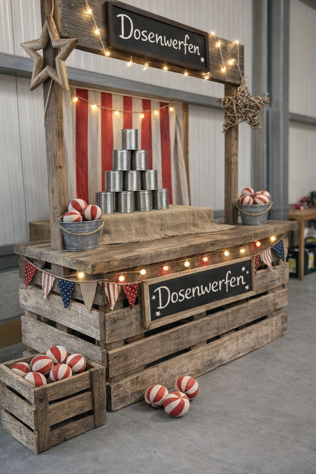 Dosenwerfen wie auf dem Jahrmarkt. Miete dir einen Dosenwerfen Stand und hol dir den Jahrmarkt nach Hause oder zu deiner Firmenfeier. Nostalgisch und perfekt aufgebaut. Aus der Glühweinbar wird ein Jahrmarktstand mit Dosenwerfen.