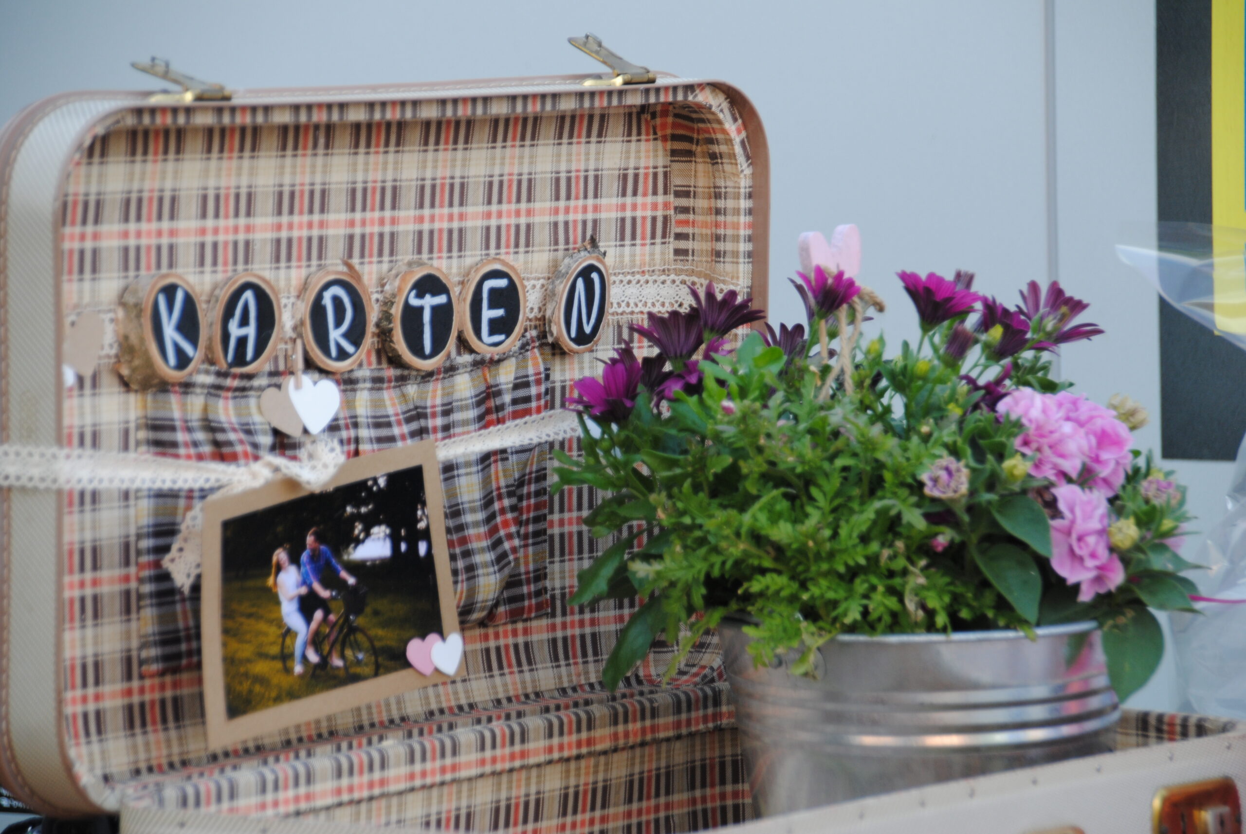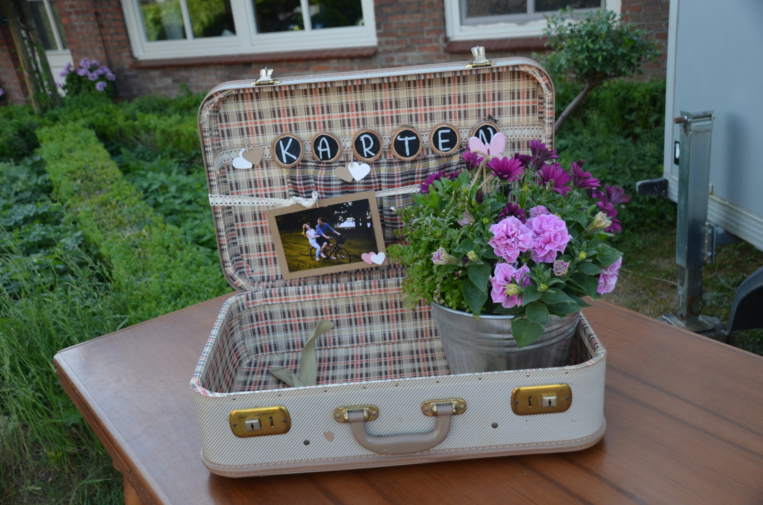 Ein Vintage Koffer vielseitig einsetzbar – perfekt für den Polterabend für die Karten oder bei der Hochzeit auf dem Geschenketisch. Oder für die Fotoecke mit Kamera. Vielseitig nutzbar und vintage Flair.