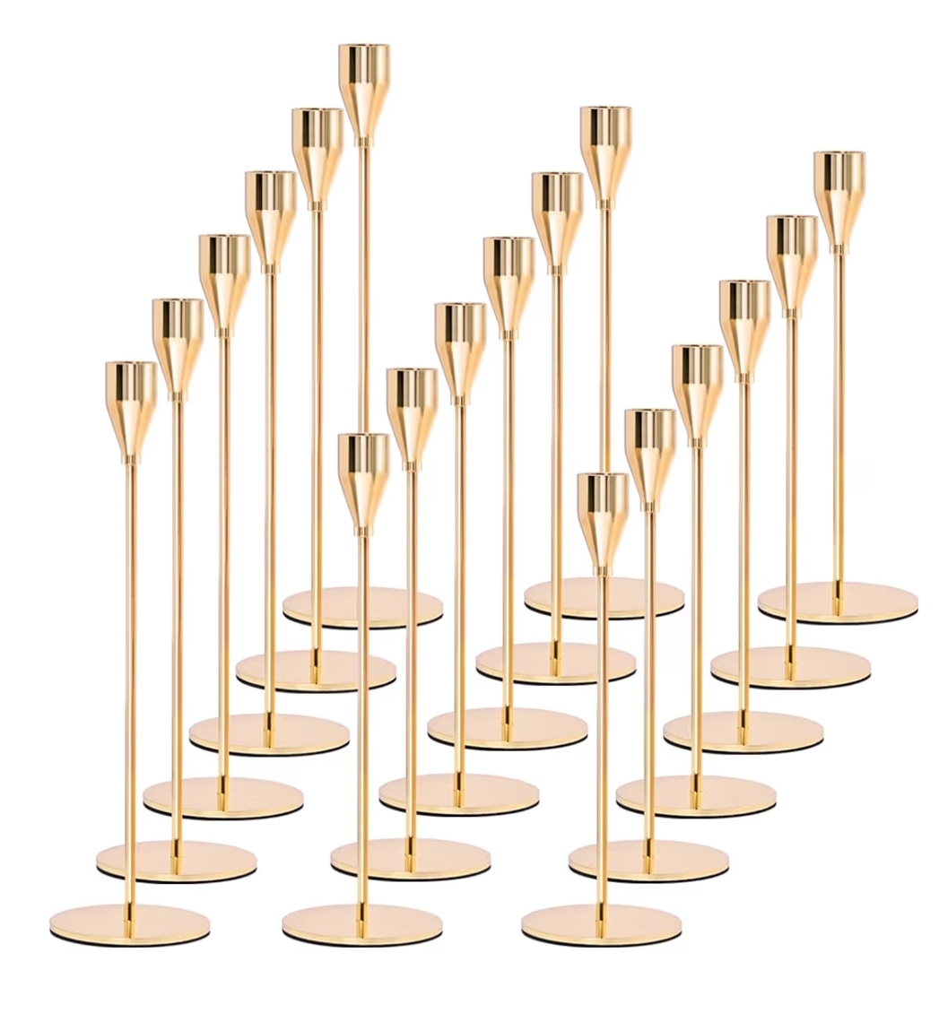 Kerzenständer in einem warmen Gold zu vermieten. Die Kerzenständer haben drei verschiedene Höhen. Zur Verfügung stehen 48  Stück. Die Kerzenständer haben folgende Höhen: Größe S: 22cm hoch | Größe M: 27,5cm | Größe L: 32,5cm