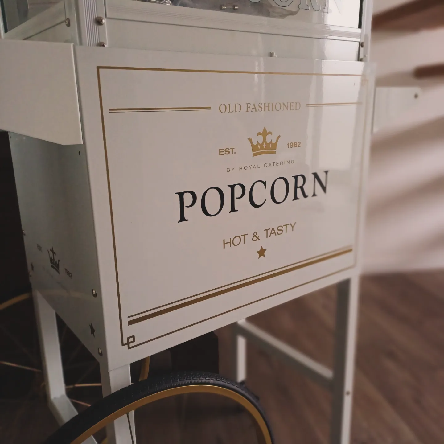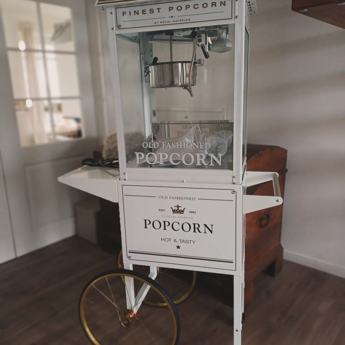 Eine weiße elegante Popcornmaschine – für jeden Anlass frisches Popcorn. Mache dein Event zu einem besonderen Erlebnis, ob für Kindergeburtstage, Hochzeiten, Firmenfeier oder Vereinsfesten. Ideal für Promoaktionen, Mitarbeiter-Events aber auch für private Feiern leckeres und frisches Popcorn. Professionelle Popcornmaschine, die leicht zu bedienen ist. Bei der Buchung sind alle Zutaten, Zubehör und Reinigung inklusive.