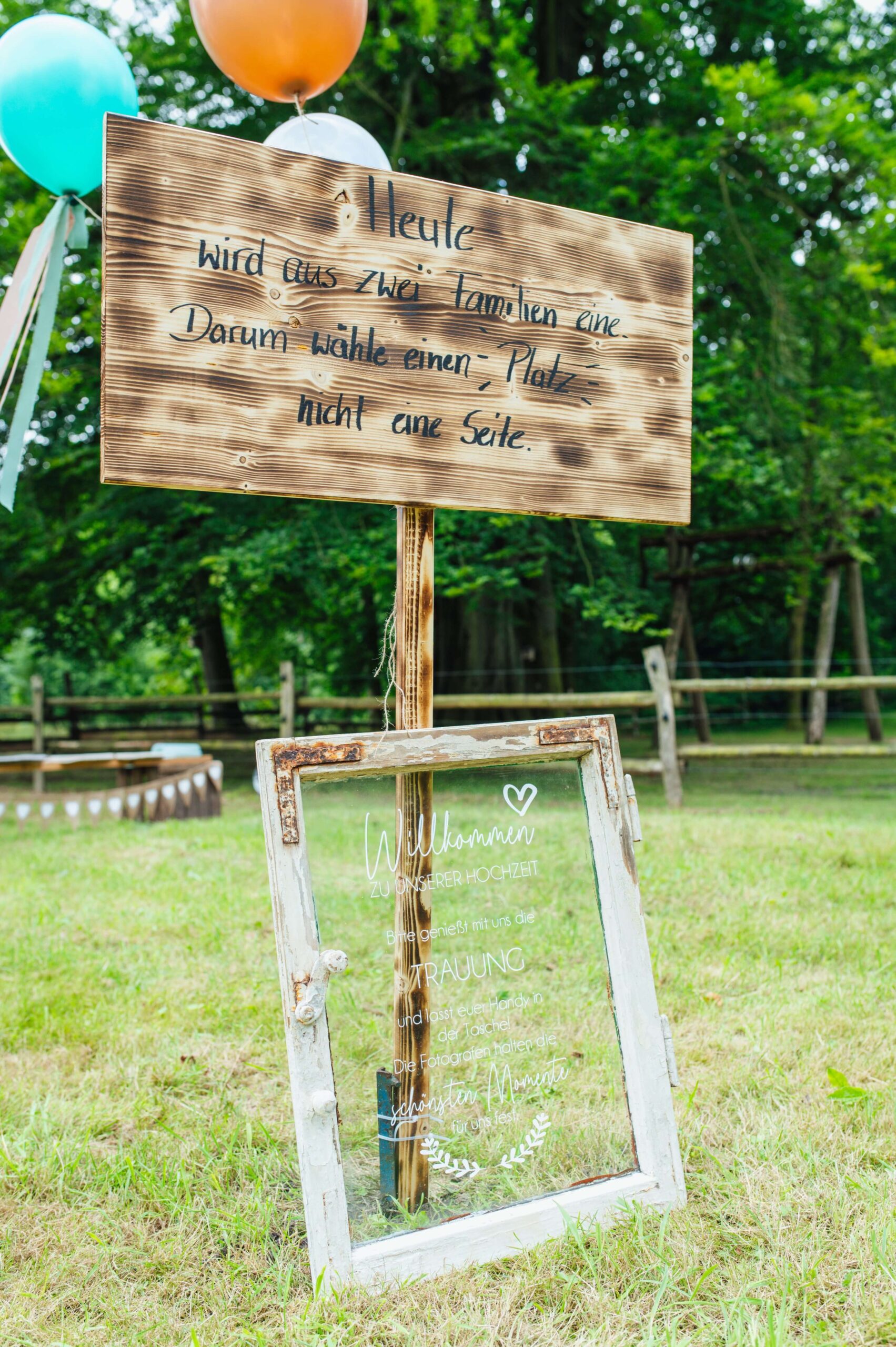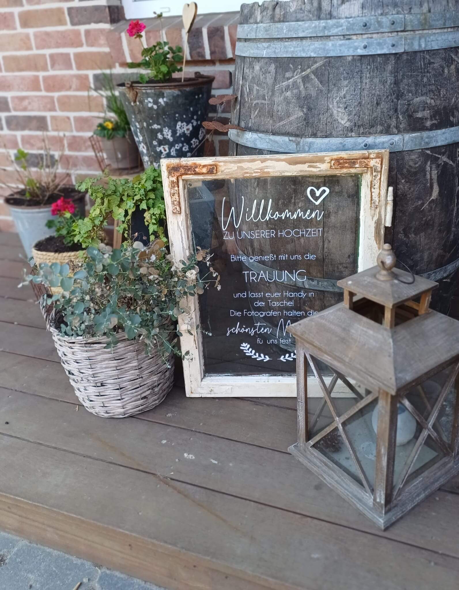 Perfekt für eure freie Trauung – eine alte Fensterscheibe als Schild für die Trauung. Ein netter Hinweis um das Handy in der Tasche zu lassen.