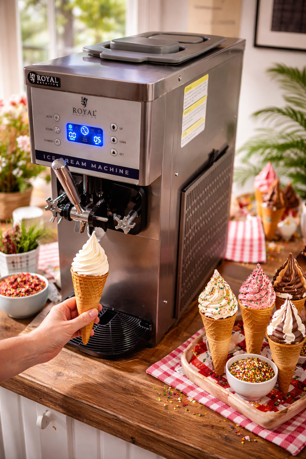 Der süße Höhepunkt auf deinem Event – Mit der hochwertigen Softeismaschine genießen eure Gäste frisches, cremiges Softeis in verschiedenen Geschmacksrichtungen. Ob Firmenfeier, Geburtstag, Hochzeit, Sommerfest oder Messe – die Softeismaschine ist leicht zu bedienen, zuverlässig und sorgt garantiert für ein Highlight. Die Maschine eignet sich eher für kleinere Veranstaltung, Die Softeismaschine macht ca. 4 Portionen, danach kühlt die Maschine und nach kurzer Zeit können wieder neue Portionen gezapft werden.
