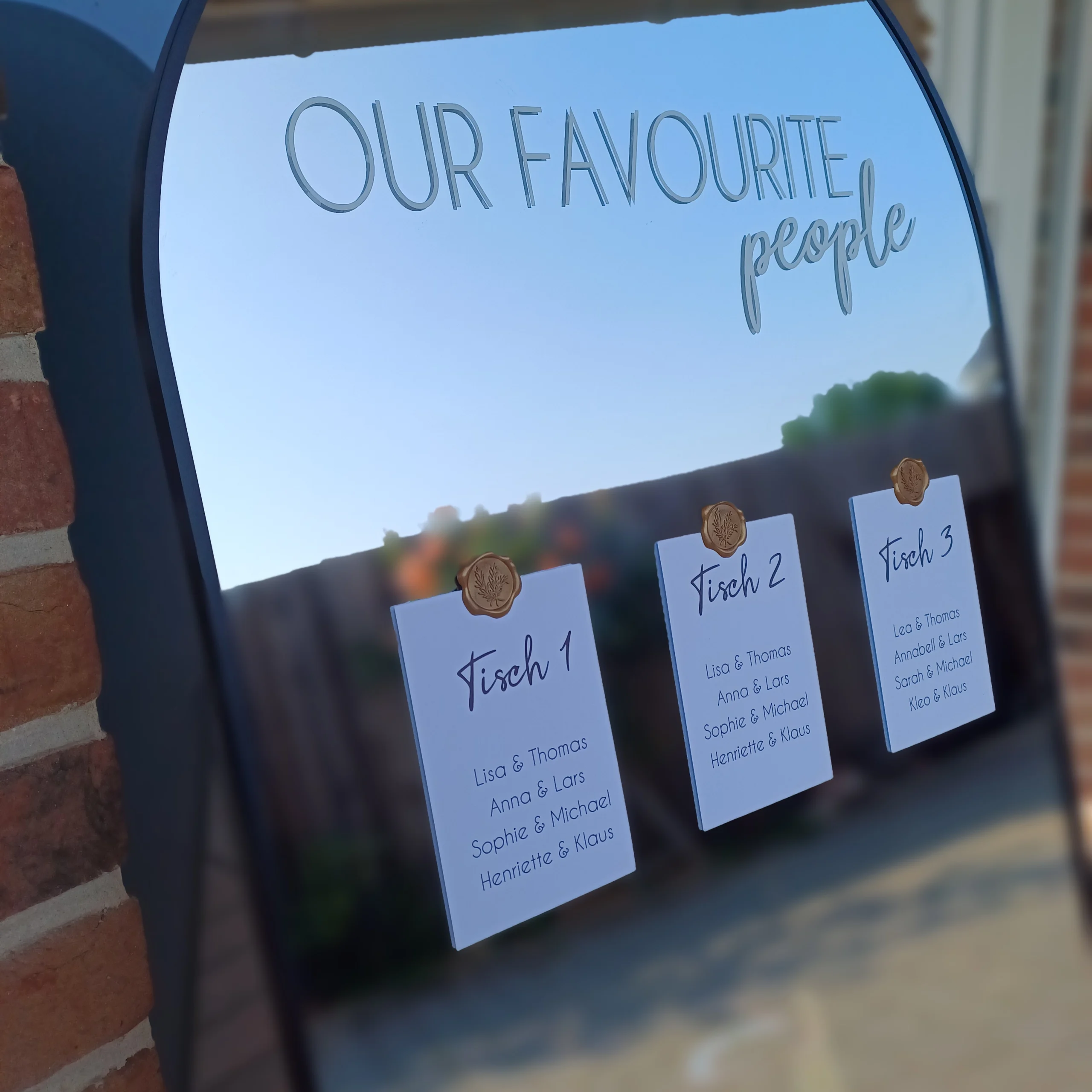 „Our favourite people“ – euer Sitzplan auf einem dekorativen Spiegel wird zum echten Hingucker. Die Tischkarten werden mit Aufklebern angebracht und schaffen so eine stilvolle Übersicht für eure Gäste.
